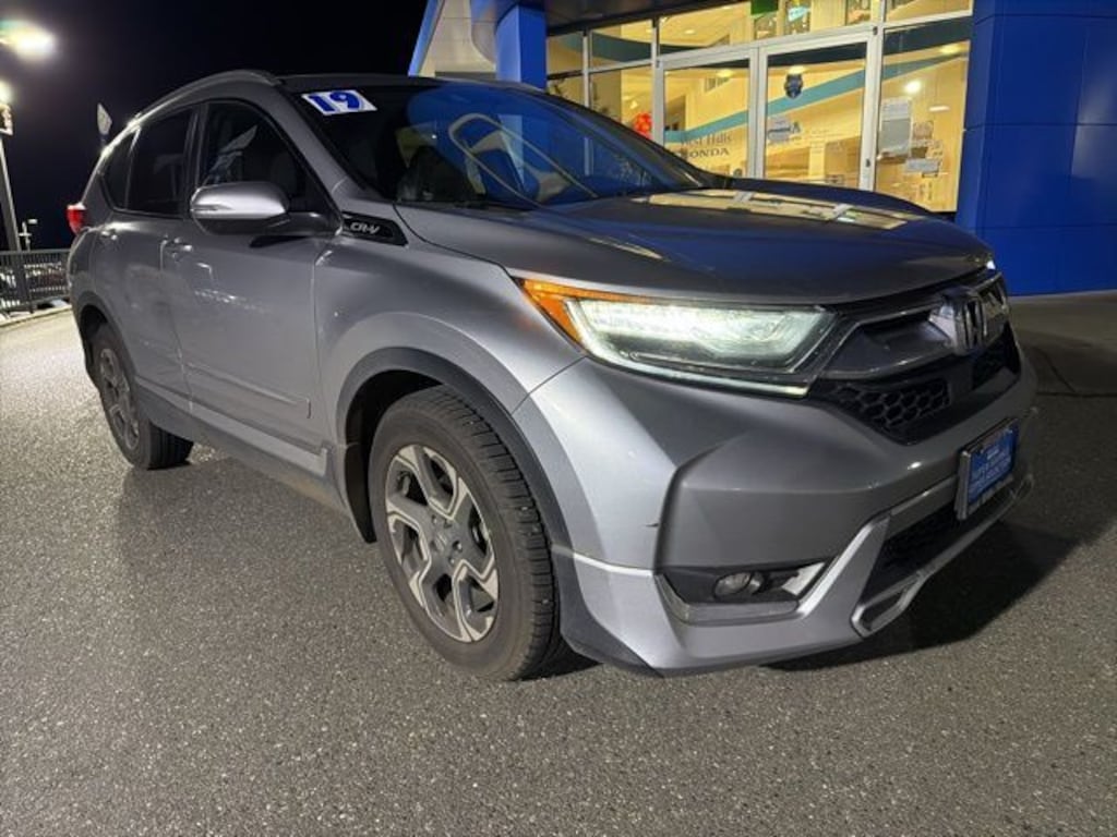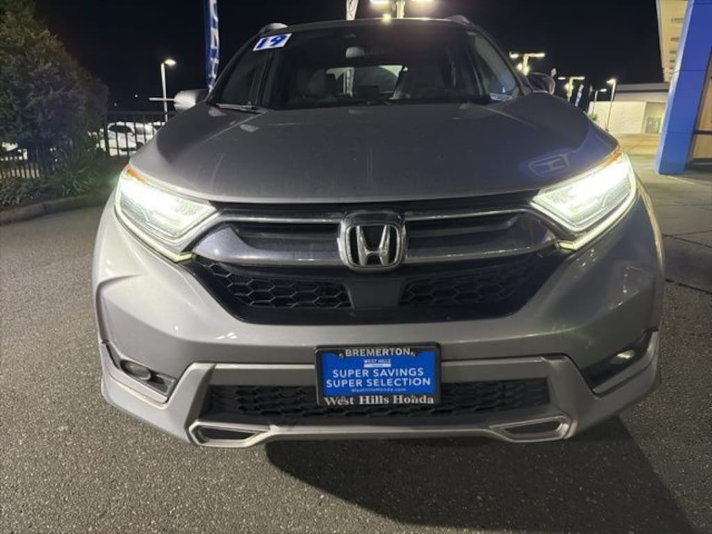 The 2019 Honda CR-V Touring is the top trim of Hondas popular compact SUV, offering a blend of efficiency, comfort, and upscale features. It comes standard with a 1.5-liter turbocharged four-cylinder engine producing around 190 horsepower, paired with a continuously variable transmission and available all-wheel drive. This model emphasizes practicality, delivering excellent fuel economy (around 2730 mpg combined) and a smooth, composed ride that balances comfort with responsive handling. As part of the Touring trim, it includes premium upgrades like leather upholstery, a hands-free power liftgate, navigation, a premium audio system, and additional chrome exterior accents.